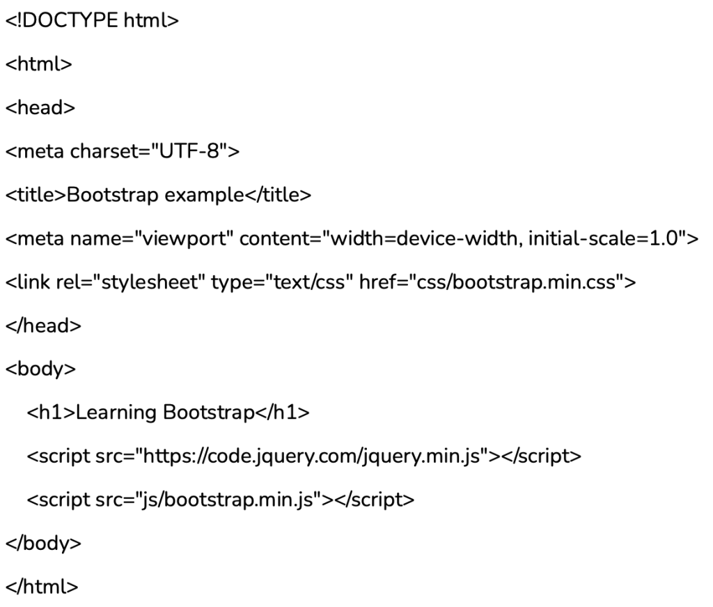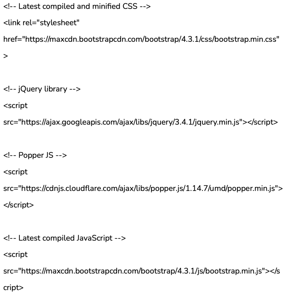 Để sử dụng Bootstrap, bạn cần thêm tham chiếu đến các tệp này vào trang web của bạn. Bạn có thể thêm tham chiếu đến các tệp này trong phần “head” của trang web của bạn: