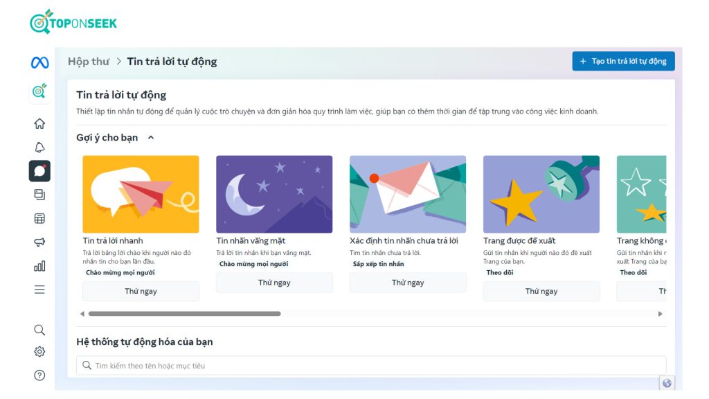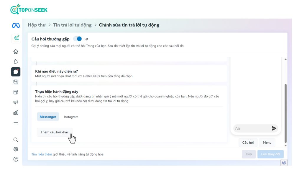 Bước 1: Truy cập vào fanpage Facebook của bạn dưới dạng quản lý >>> Bước 2: Nhấn vào phần Quản lý nằm ở đầu trang >>> Bước 3: Tại Bảng điều khiển chuyên nghiệp lướt xuống, chọn Hộp thư ở mục Công cụ trên nền tảng. >>> Bước 4: Nhấn chọn Trả lời tự động ngay trên đầu trang hiển thị. >>> Bước 5: Cài đặt tin nhắn tự động tùy thích dựa theo gợi ý. >>> Bước 6: Để cài đặt cụ thể hơn hãy lướt xuống mục Hệ thống tự động hóa của bạn, chọn Chỉnh sửa. >>> Bước 7: Tiếp tục kéo xuống và nhấn vào Thêm câu hỏi khác để thiết lập Chatbot theo đúng nhu cầu của bạn.