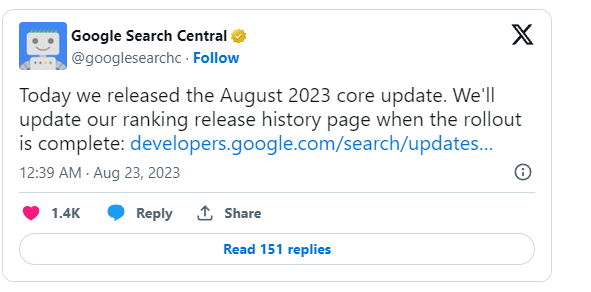 “Hôm nay chúng tôi sẽ ra phát hành bản Broad Core Update Tháng 8 2023. Chúng tôi sẽ cập nhật trang lịch sử phát hành về thứ hạng của mình sau khi hoàn thành việc triển khai.”