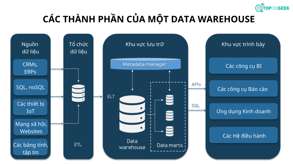 Một kho dữ liệu bao gồm nhiều thành phần hoạt động theo tuần tự – Nguồn Internet