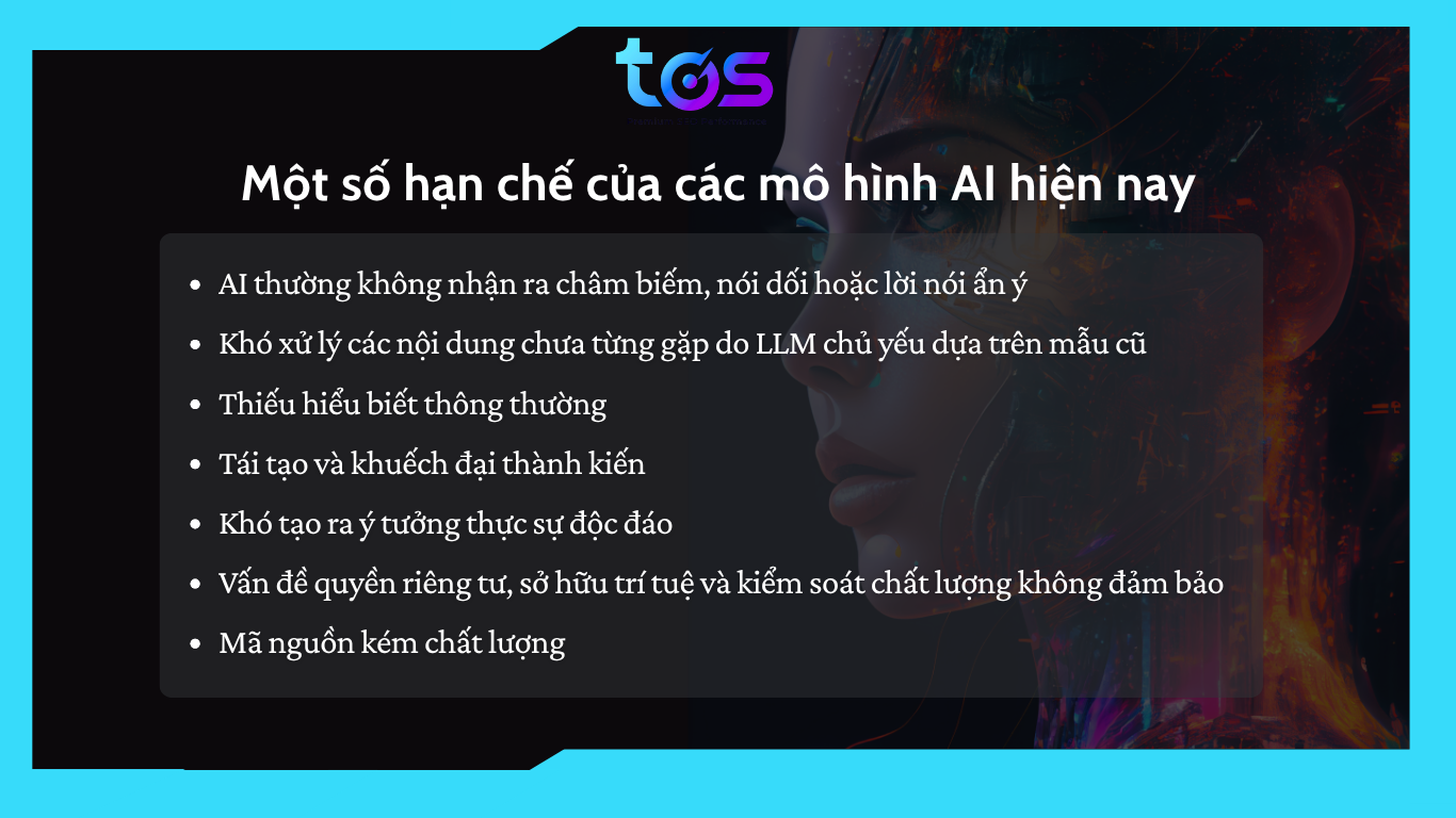 Dù AI tạo sinh đang phát triển nhanh và ứng dụng rộng rãi, các mô hình hiện tại vẫn tồn tại nhiều hạn chế. Dưới đây là danh sách liệt kê một số hạn chế của các mô hình AI hiện nay: