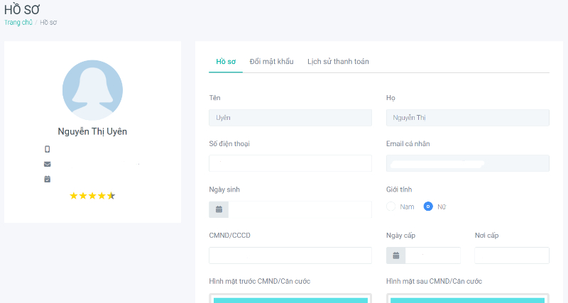 Bước 1: Sau khi đăng nhập hệ thống, các bạn vào phần “Hồ sơ” ở menu phía bên trái màn hình và cập nhật các thông tin còn thiếu bao gồm ảnh đại diện, hình ảnh hai mặt CCCD/CMND (bắt buộc) và các thông tin cá nhân,… tại mục “Hồ sơ”