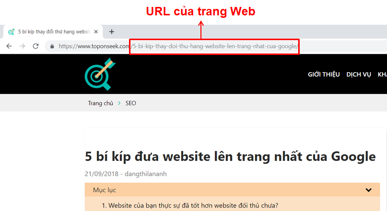 Ví dụ: Với trang web https://www.toponseek.com/5-bi-kip-thay-doi-thu-hang-website-len-trang-nhat-cua-google/ thì URL là ”/5-bi-kip-thay-doi-thu-hang-website-len-trang-nhat-cua-google/ ”