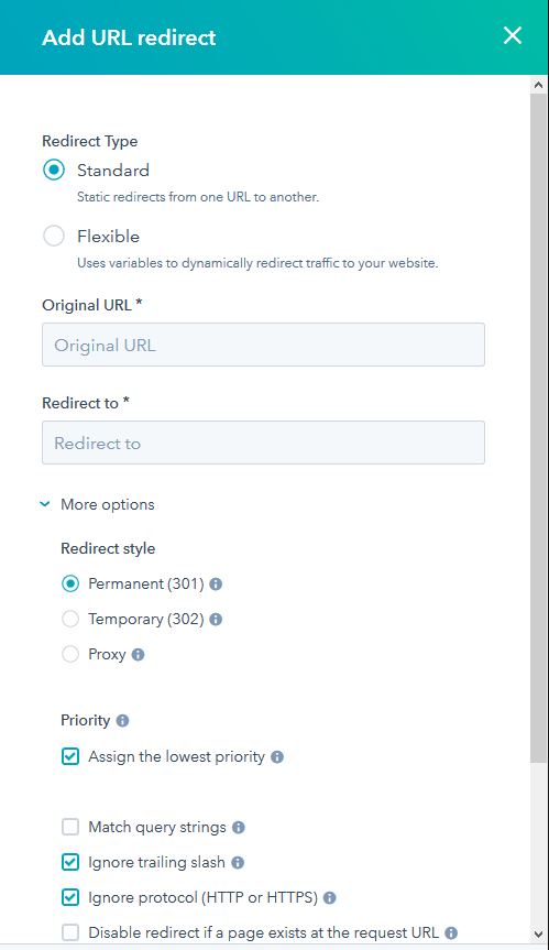HubSpot cung cấp các biến thể nâng cao khác nhau về các loại redirect này. Thay vào đó, nó sẽ cho phép bạn phân phối Redirect tạm thời 302, chọn thứ tự mà HubSpot di chuyển qua các quy tắc redirect khi giải quyết một URL (có thể thay đổi quy tắc hợp lệ được kích hoạt), vô hiệu hóa redirect nếu nội dung có tại URL, giữ nguyên truy vấn chuỗi, buộc HTTPS và buộc dấu gạch chéo ở cuối tất cả các URL.